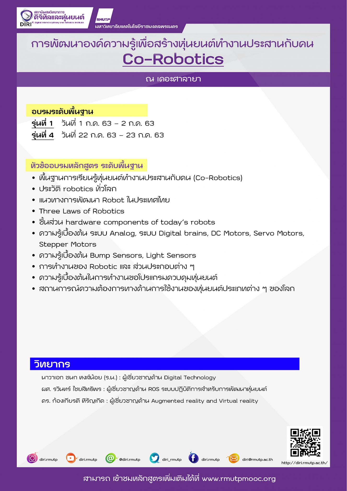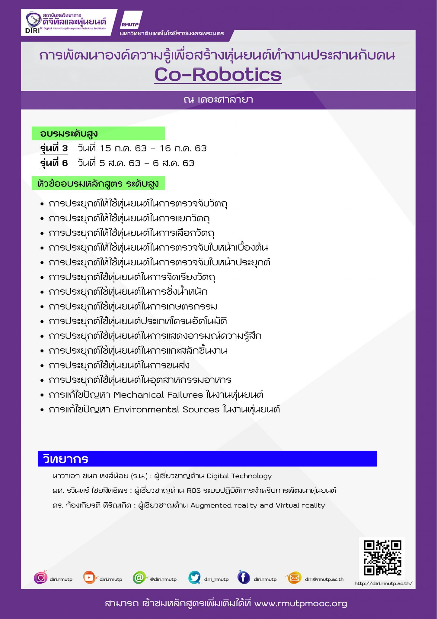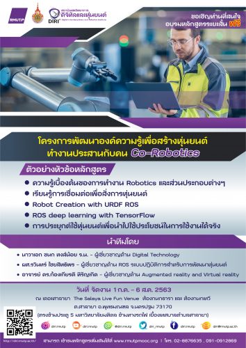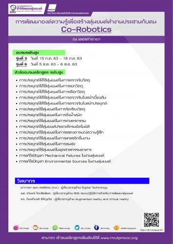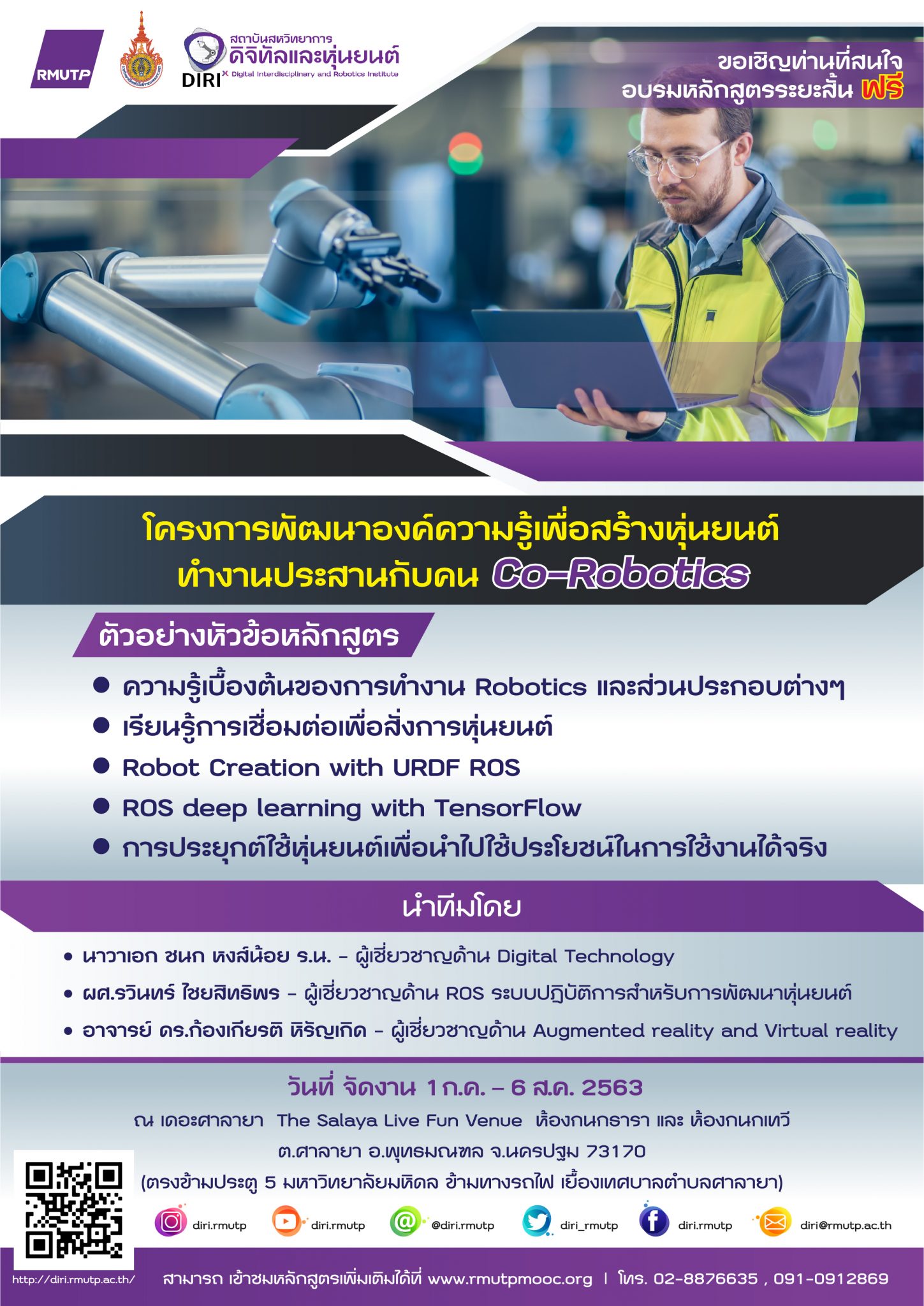 สถาบันสหวิทยาการดิจิทัลและหุ่นยนต์ มหาวิทยาลัยเทคโนโลยีราชมงคลพระนคร ขอเชิญชวนนักศึกษาบุคลากรราชมงคลพระนคร และผู้สนใจจากภาคอุตสาหกรรมทุกท่าน เข้าร่วมพัฒนาองค์ความรู้ครั้งนี้ โดยมีหัวข้อหลักสูตรที่น่าสนใจ อาทิ ความรู้เบื้องต้นของการทำงาน Robotics เรียนรู้การเชื่อมต่อเพื่อสั่งการหุ่นยนต์ Robot Creation with URDF ROSฯลฯ นำทีมโดยวิทยากรผู้เชี่ยวชาญด้าน AR , VR และระบบ ROS แล้วพบกันวันที่ 1 กรกฎาคม – 6 สิงหาคม 2563 ณ เดอะศาลายา The Salaya Live Fun Venue จ.นครปฐม สอบถามได้ที่ 02-8876635 , 091-0912869 หรือ https://bit.ly/3futX7v *กำหนดการอาจมีการปรับเปลี่ยน เพื่อความเหมาะสมอีกครั้ง