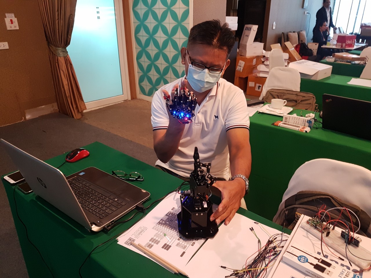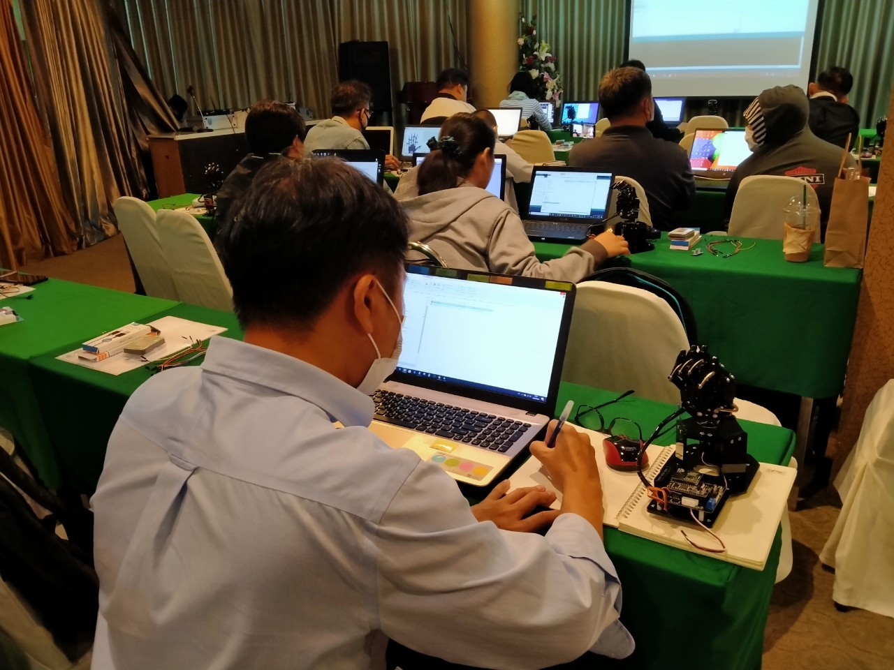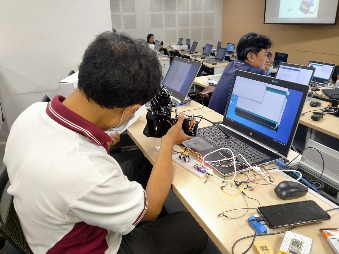 สถาบันสหวิทยาการดิจิทัลและหุ่นยนต์ มหาวิทยาลัยเทคโนโลยีราชมงคลพระนคร จัดโครงการอบรม “พัฒนาหลักสูตรและเนื้อหาวิทยาการหุ่นยนต์ฮิวแมนนอยด์ เพื่ออุตสาหกรรมบริการและการศึกษาด้วยเทคโนโลยีแบบ mix reality” โดยผู้เข้าอบรมจะได้รับเนื้อหาและความรู้ในเรื่องของ การใช้งานโปรแกรม Unity , ทดสอบการเขียนคำสั่งบังคับ servo motor , ควบคุมบอร์ดคอนโทรเลอร์ผ่าน AR และ Workshop มือกล ฯลฯ การอบรมในครั้งนี้ได้รับความสนใจจากผู้เข้าร่วมอบรมเป็นอย่างดี อาทิ นักศึกษา บุคลากรภาครัฐและภาคอุตสาหกรรมมากมาย ฯลฯ การอบรมจัดขึ้นทั้งหมด 6 รุ่น ระหว่างวันที่ 13 – 30 สิงหาคม 2563 ณ สำนักบริการคอมพิวเตอร์ มหาวิทยาลัยเกษตรศาสตร์ (บางเขน)