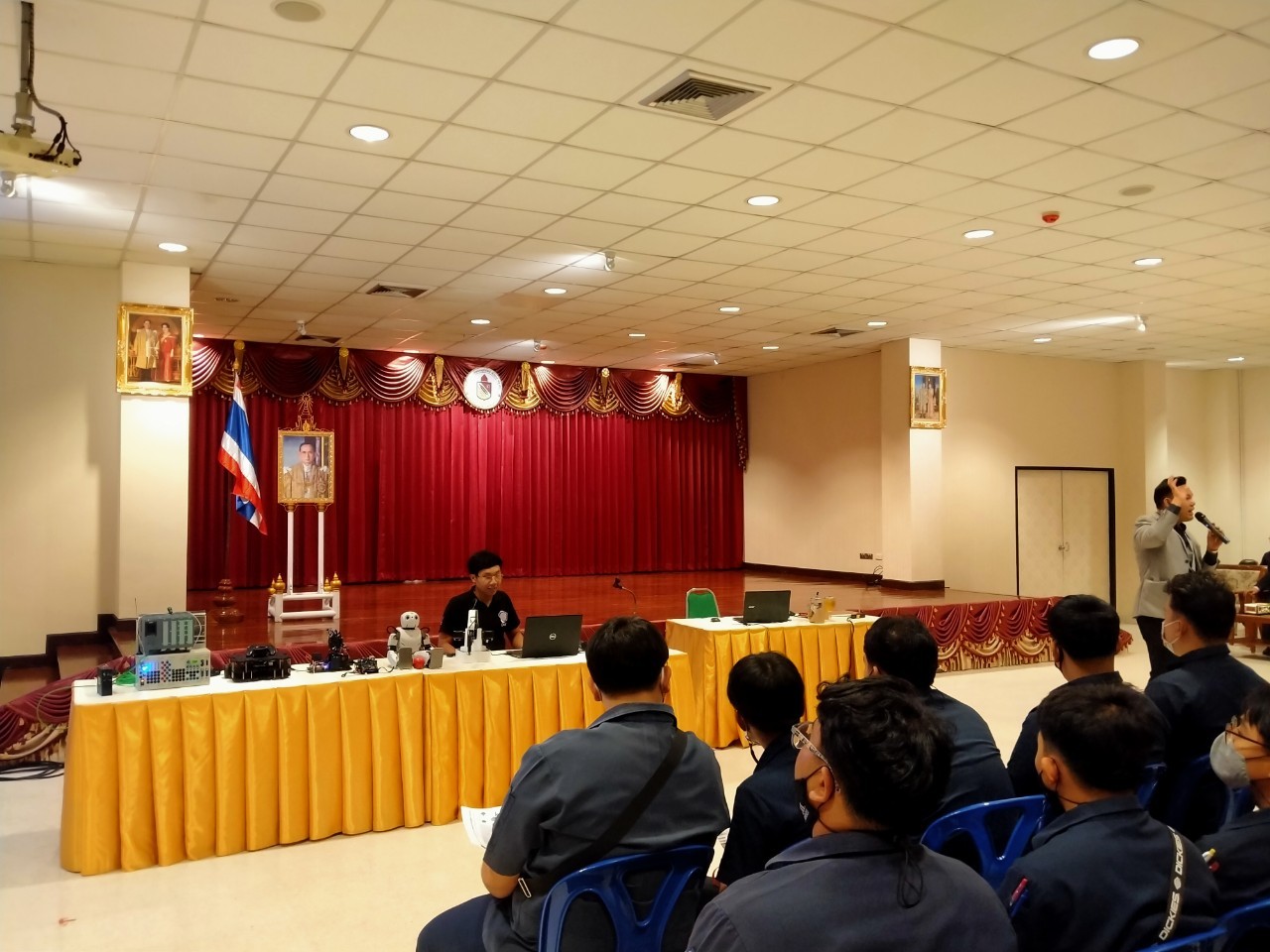 บุคลากรสถาบันสหวิทยาการดิจิทัลและหุ่นยนต์ ร่วมกับ คณะวิศวกรรมศาสตร์ มหาวิทยาลัยเทคโนโลยีราชมงคลพระนคร “จัดโครงการถ่ายทอดองค์ความรู้สหวิทยาการดิจิทัลและหุ่นยนต์เพื่อการพัฒนาอย่างยั่งยืน” โดยได้รับเกียรติจาก ดร.ณัฐวรพล รัชสิริวัชรบุล คณบดีคณะวิศวกรรมศาสตร์ บรรยายหัวข้อเทคโนโลยีอุตสาหกรรม 4.0 การถ่ายทอดความรู้ในด้านการเขียนโปรแกรมควบคุมหุ่นยนต์อุตสาหกรรม , หุ่นยนต์เคลื่อนที่อัตโนมัติ (Autonomous Mobile Robot : AMR) หุ่นยนต์บริการ (Service robot) , ระบบ SCADA และ Industrial IOT (IIOT) , ปัญญาประดิษฐ์ การประมวลผลภาพ (AI and Image processing) เป็นต้น การจัดกิจกรรมดังกล่าว ได้รับความสนใจจากผู้เข้าร่วมกิจกรรมจำนวนมาก อาทิ ผู้อำนวยการ อาจารย์ บุคลากร และนักศึกษา ณ โรงเรียนกองทัพบกอุปถัมภ์ ช่างกล ขส.ทบ. เมื่อวันที่ ๘ ธันวาคม พ.ศ. ๒๕๖๓