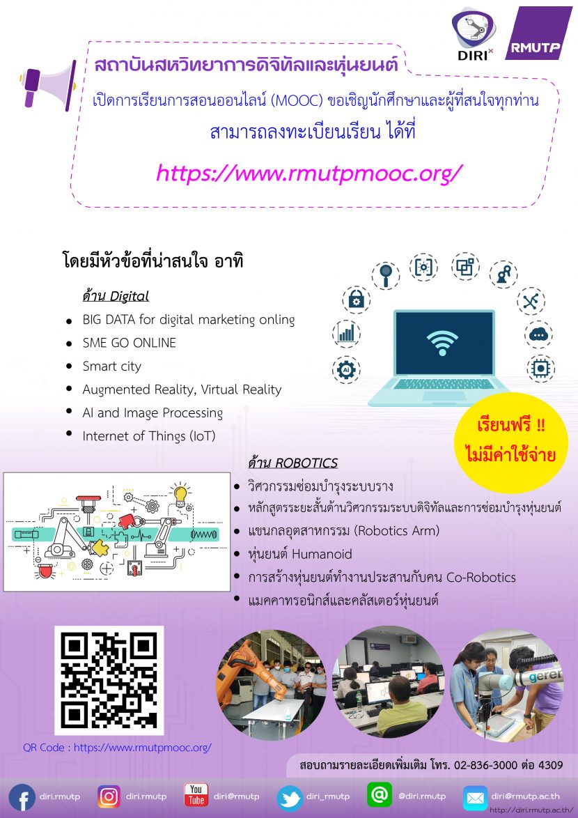 สถาบันสหวิทยาการดิจิทัลและหุ่นยนต์ มหาวิทยาลัยเทคโนโลยีราชมงคลพระนคร เปิดหลักสูตรการเรียนการสอนออนไลน์ (Mooc) ให้กับนักศึกษา […]